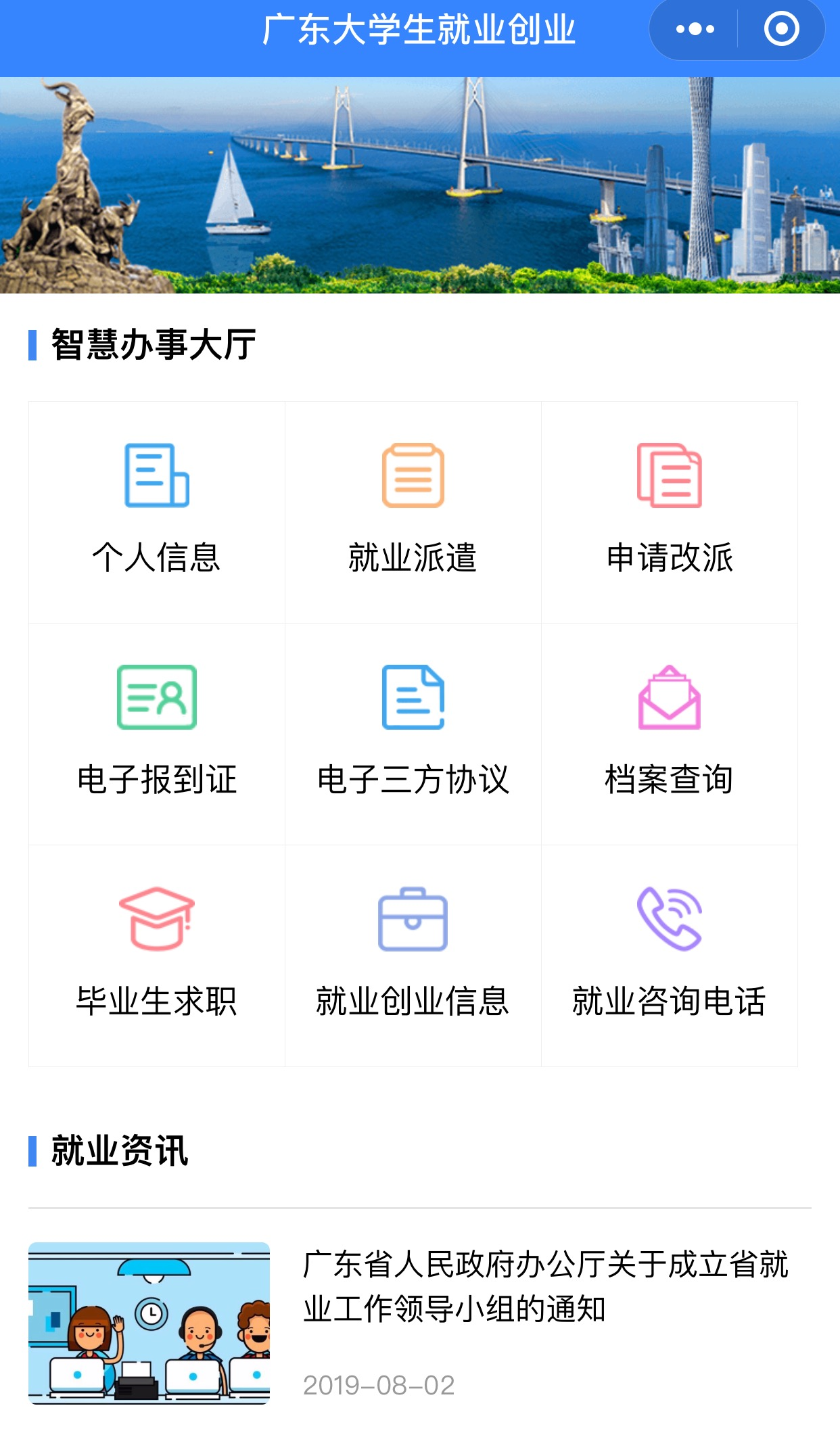 根据广东省教育厅相关要求,为做好2020届毕业生就业管理与服务工作,推广使用广东省高校毕业生就业创业智慧服务平台(以下简称就业服务平台),请2020届毕业生于10月16日前关注“广东老员工就业创业”官方微信公众号,进行毕业生生源信息绑定(操作流程详见后文介绍)。毕业生绑定生源信息后,可通过就业服务平台员工端办理就业信息上报、电子报到证、申请改派、电子三方协议、档案查询、毕业生求职等就业手续。该平台对于毕业生非常重要,务必认真按指南逐条填写: