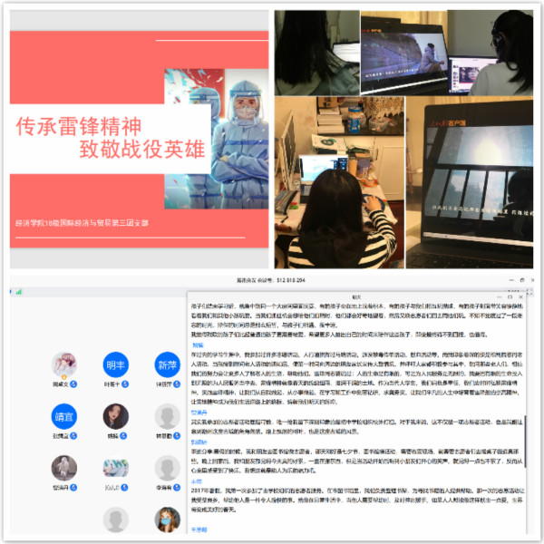 2017级国际经济与贸易专业第四团支部以幻灯片演示与视频观看相结合的方式开展线上班会,让同学们对各行各业的抗疫“逆行者”的壮举有了更深入的了解。值得称道的是,该团支部唐俊晓等4名同学在疫情期间参与了志愿服务,以实际行动践行和发扬雷锋精神。2019级经济学专业第二团支部以“我们不是孤单一人”为主题开展线上班会,同学们在会上分享自己参与公益的经历,宣讲抗疫志愿者的事迹,传递守望相助的温暖和力量。2018级国际经济与贸易专业第三团支部以“传承雷锋精神,致敬战疫英雄”为主题开展系列活动,通过观看视频、开展线上抗疫知识竞答等方式,向同学们普及疫情防控知识,引导同学们学习抗疫英雄的责任与担当。2018级国际经济与贸易专业第一团支部以主题演讲的形式开展活动,同学们通过分享医护人员请战抗疫、企业爱心捐赠等感人事迹,让大家真切地感受到全国上下众志成城、齐心抗疫的民族凝聚力和自豪感。2018级税收学专业第一团支部以宿舍为单位展示各自收集的“最美瞬间”,用最直观的方式叙述身边发生的生动事迹,诠释雷锋精神“平凡而伟大”的人格力量。