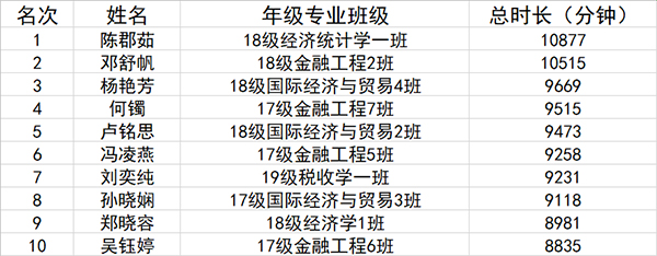 学习总时长前十排名(冯译漫 供)