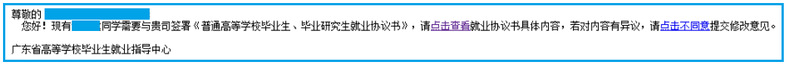 经公司和公司审核后,省就业系统将自动发送一封邮件到《电子协议书》上签约单位的邮箱(如果没有收到邮件请留意是否被转到垃圾箱)。签约单位若对内容有异议,请“点击不同意”提交修改内容,毕业生则可修改协议书内容。