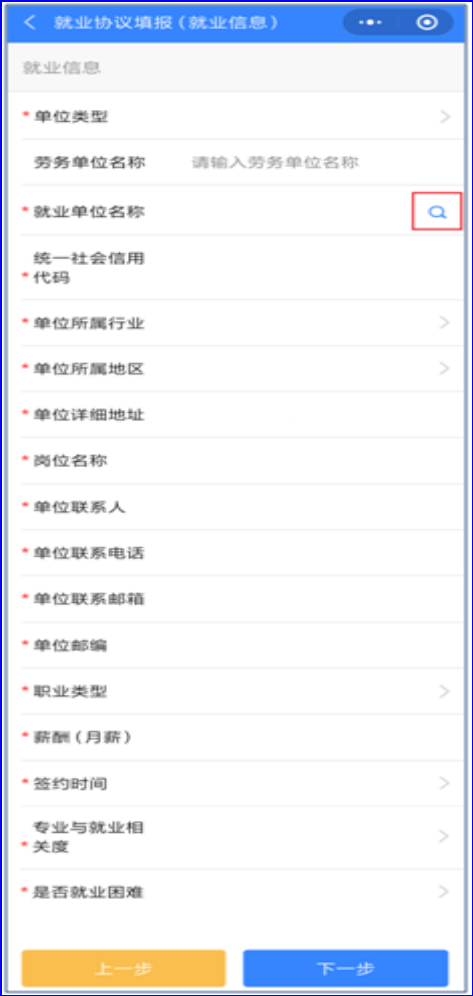 (3)★就业单位名称:毕业生就业单位的全称,不可以填报单位的简称或缩写,须与工商注册或法人代表证一致的名称;可点击搜索名称,如无法搜索,可与签约单位确认全称,或登录国家企业信用信息公示系统(http://www.gsxt.gov.cn)等第三方平台查询;