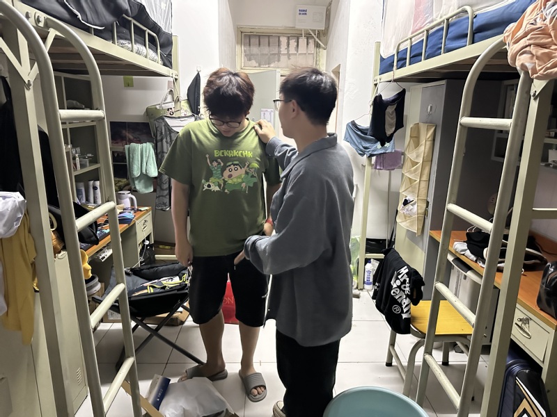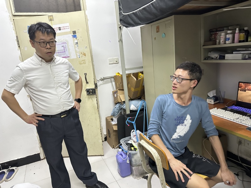 刘坤钊老师对员工进行宿舍内务卫生教育(周圣佳 摄)