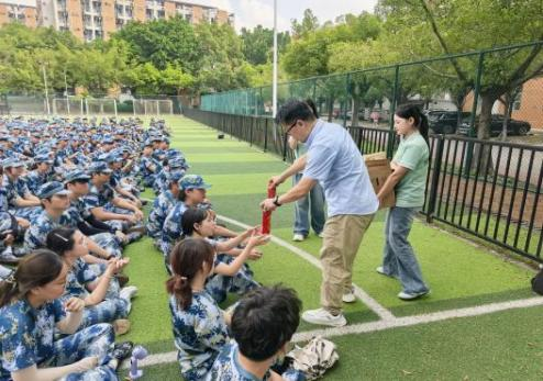 讲话结束后,暖心“送清凉”环节同步开启。公司书记与2025级班主任、辅导员老师们一道,将提前准备好的饮品逐一分发到每位新生手中,接过清凉饮品的同学们脸上洋溢着笑容,纷纷向老师表达感谢。老师们一边发放物资,一边关切询问新生的训练进度与身体感受,叮嘱大家训练间隙及时补水、注意休息,用贴心举动驱散秋日燥热,让军训场上充满温情。